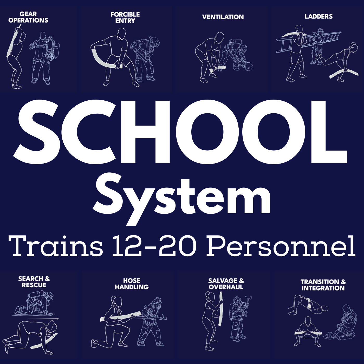 Can be used indoor / outdoor, ideal for recreation space or training yard. Double over this fitness and movement program as a skills training toolset for our 8 training categories of fire ground activity: Hose Handling, Search & Rescue, Forcible Entry, Ladders, Ventilation, Salvage & Overhaul, Gear Operations, Transition & Integration.