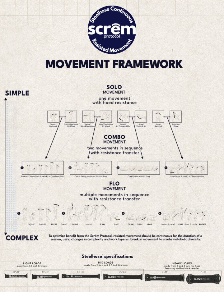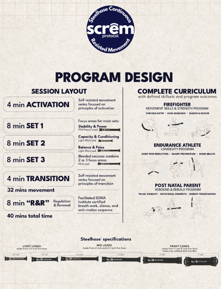 Our complete curriculum, the Steelhose Continuous Resisted Movement (Scrēm) Protocol, in a handy program planner. The Fire Version includes Teaching Guides for our complete 101 Fire Movement Skills & Strength curriculum.